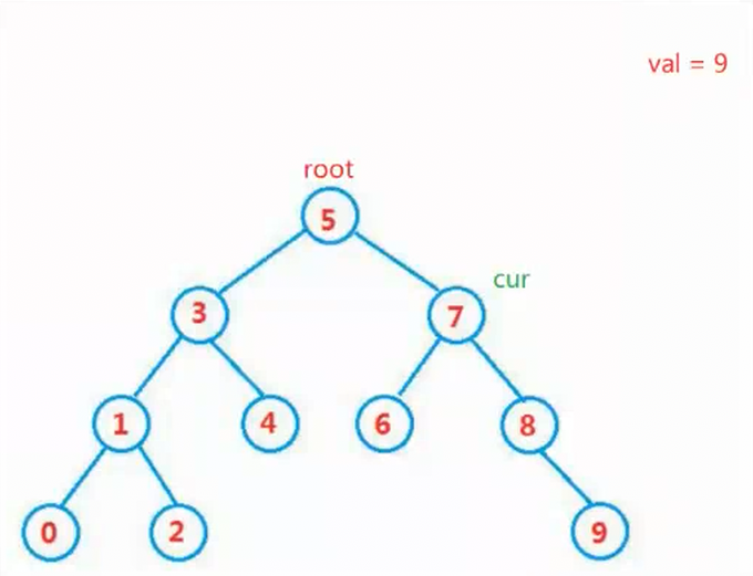 cur.val < val:目标值可能在右子树中,将cur移至右子节点 - 若