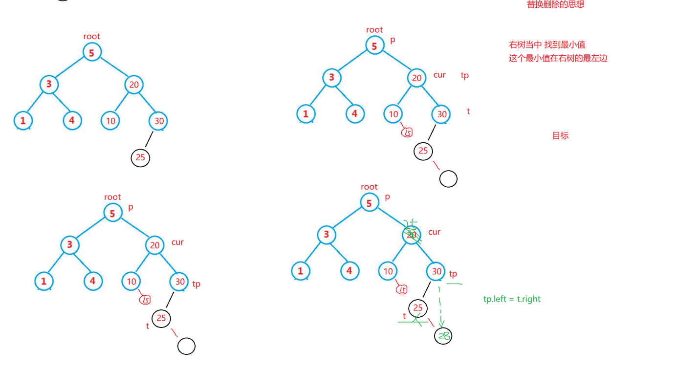 但是如果25左右两边都还有节点那就不能放到这,同理15也是,那就是25的左边,就是找删除节点右边最小的如果一直还有节点的前提下,其实就是右树的最左边