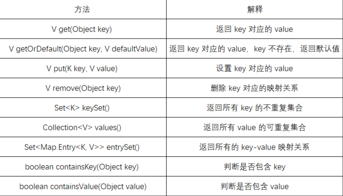 import java.util.Map;public static void TestMap(){Map<String, String> m = new TreeMap<>();// put(key, value):插入key-value的键值对// 如果key不存在,会将key-value的键值对插入到map中,返回nullm.put("林冲", "豹子头");m.put("鲁智深", "花和尚");m.put("武松", "行者");m.put("宋江", "及时雨");String str = m.put("李逵", "黑旋风");System.out.println(m.size());System.out.println(m);// put(key,value): 注意key不能为空,但是value可以为空// key如果为空,会抛出空指针异常//m.put(null, "花名");str = m.put("无名", null);System.out.println(m.size());// put(key, value):// 如果key存在,会使用value替换原来key所对应的value,返回旧valuestr = m.put("李逵", "铁牛");// get(key): 返回key所对应的value// 如果key存在,返回key所对应的value// 如果key不存在,返回nullSystem.out.println(m.get("鲁智深"));System.out.println(m.get("史进"));//GetOrDefault(): 如果key存在,返回与key所对应的value,如果key不存在,返回一个默认值System.out.println(m.getOrDefault("李逵", "铁牛"));System.out.println(m.getOrDefault("史进", "九纹龙"));System.out.println(m.size());//containKey(key):检测key是否包含在Map中,时间复杂度:O(logN)// 按照红黑树的性质来进行查找// 找到返回true,否则返回falseSystem.out.println(m.containsKey("林冲"));System.out.println(m.containsKey("史进"));// containValue(value): 检测value是否包含在Map中,时间复杂度: O(N)// 找到返回true,否则返回falseSystem.out.println(m.containsValue("豹子头"));System.out.println(m.containsValue("九纹龙"));// 打印所有的key// keySet是将map中的key防止在Set中返回的for(String s : m.keySet()){System.out.print(s + " ");}System.out.println();// 打印所有的value// values()是将map中的value放在collect的一个集合中返回的for(String s : m.values()){System.out.print(s + " ");}System.out.println();// 打印所有的键值对// entrySet(): 将Map中的键值对放在Set中返回了for(Map.Entry<String, String> entry : m.entrySet()){System.out.println(entry.getKey() + "--->" + entry.getValue());}System.out.println();