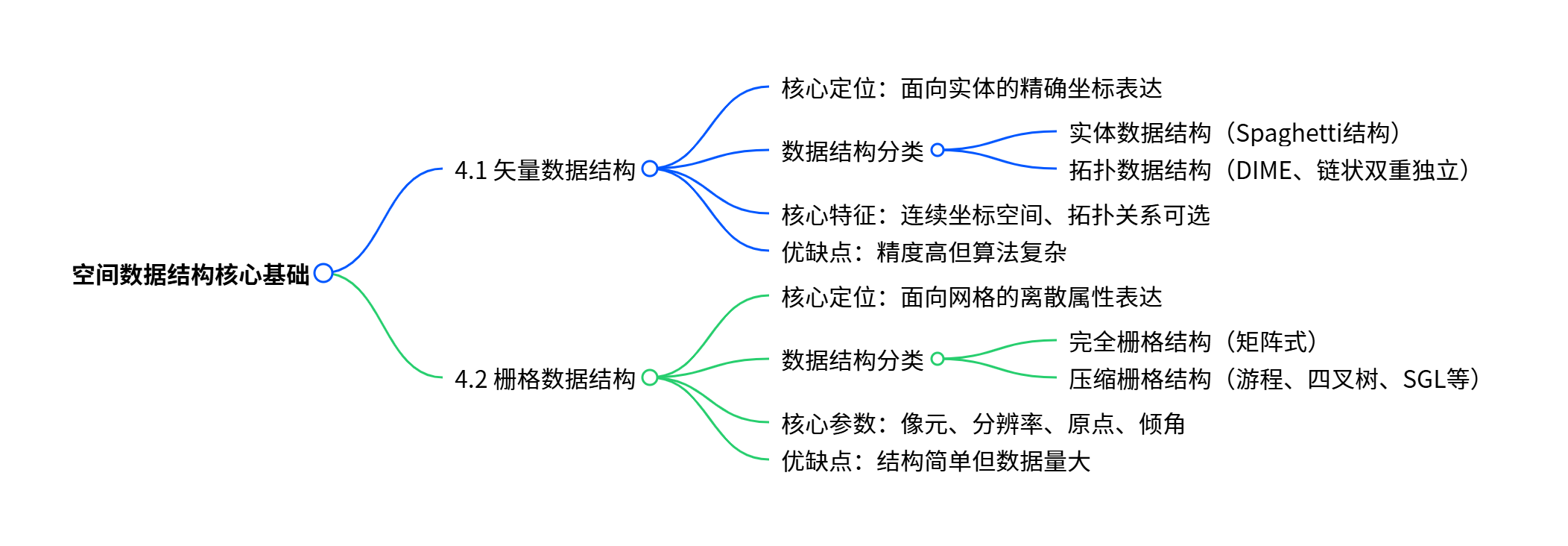 拓扑数据结构 | 点独立存储,线连点、面构线,记录拓扑关系 | 优点:消除冗余、支持拓扑检查(无悬挂弧段)、适配网络分析;缺点:结构复杂、维护成本高 |