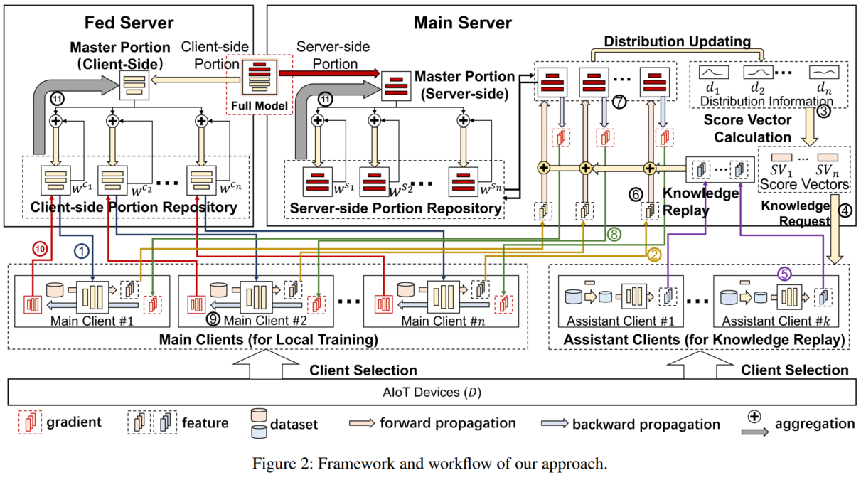 与传统的联邦学习方法不同,SFL将每个参与的深度神经网络模型分为两部分,即客户端部分和服务器端部分,并分别部署在两个云服务器上,即联邦服务器和主服务器。但是SFL在面对数据异质性和灾难性遗忘时同样脆弱,尤其在non-IID数据时,SFL会出现“梯度发散”问题,导致全局模型性能下降。