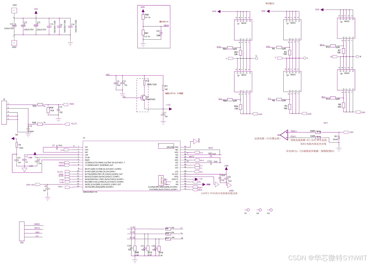 华芯微特 SWM22DK8U7 为吸尘器量身打造的高效智能控制方案。芯片内部集成 6N 预驱与 5V LDO,PCB板面更简洁,其中6N预驱耐压能达到70V。借助高精度 PWM 与 FOC 算法,电机转速、扭矩瞬时响应,吸力随“尘”应变;自动清洁模式、灰尘感应、电池健康管理等,续航、吸力、静音完美平衡。从此,地毯、缝隙、硬地皆能一键深度净洗,清洁体验高效又省心。