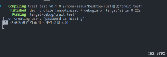这时就可以将UserParseError作为异常使用了,但如果我们像自定义异常输出,我们需要再实现Display这个Trait,以对产生不同的错误时,打印不同的消息提示: