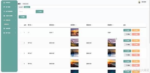 问题反馈功能在视图层。问题反馈页面的输入栏中输入用户名进行搜索,可以查看到用户发送的反馈详细信息,并根据需要进行修改、回复或者删除等操作;如图4-9所示。