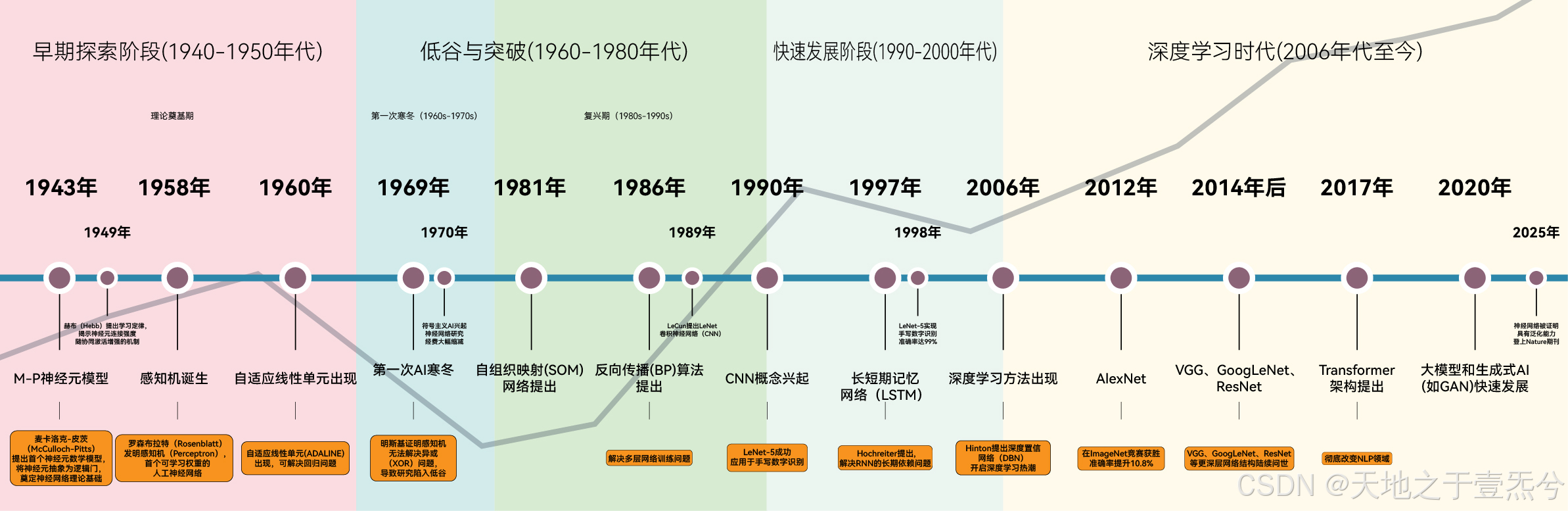 神经网络发展的主要里程碑事件时间线图,展示了从早期理论到现代应用的完整演进过程: