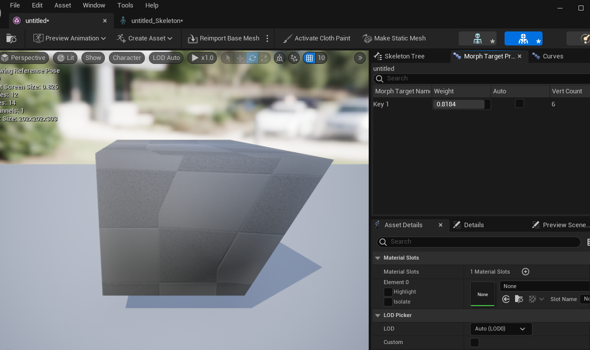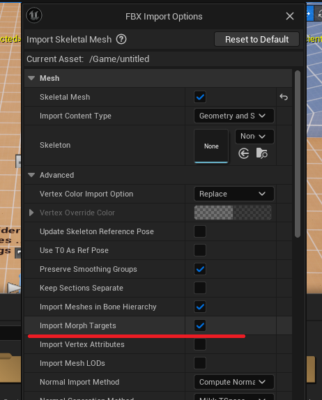4.用Blender导出FBX,导入UE5测试。导入时需要勾选ImportMorphTargets