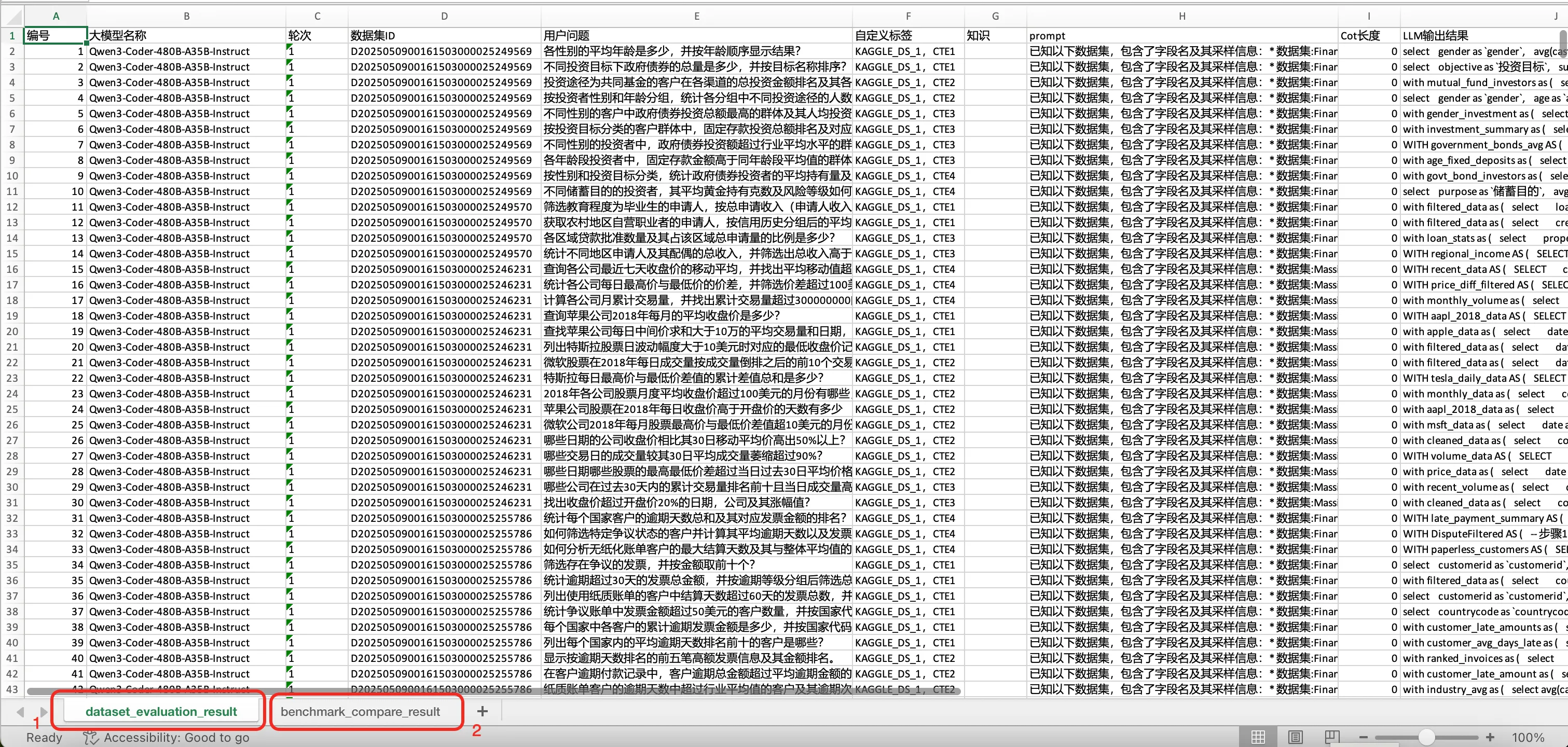 - 下载的Excel报告包含了评测任务LLM执行详情、评测对比结果等信息(通过不同Sheet展示)