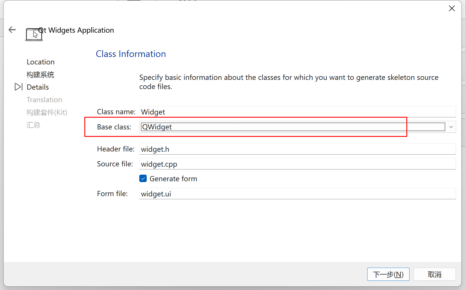 4.2 无脑下一步 , 创建类的时候选择widget :