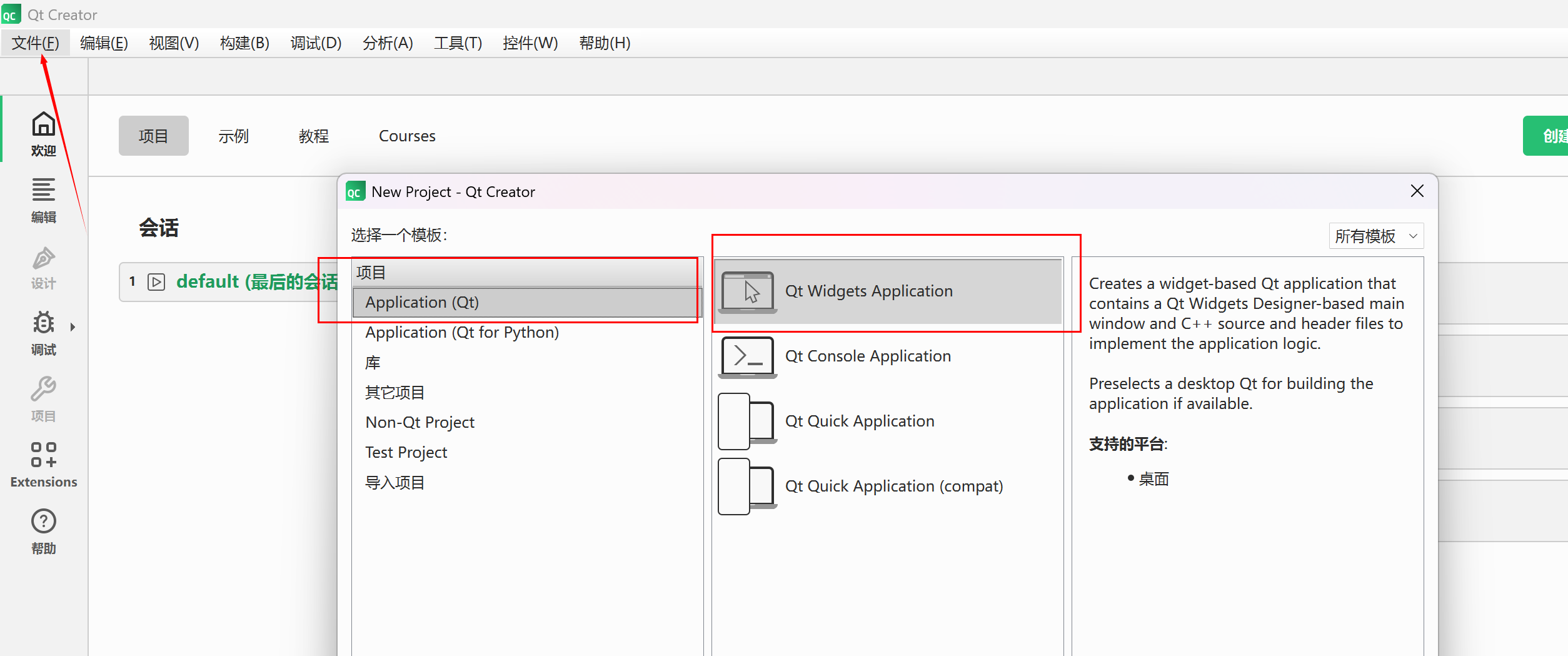 4.1 点击左上角文件,点击new project 创建一个新项目 , 选择Widgets(控件),创建