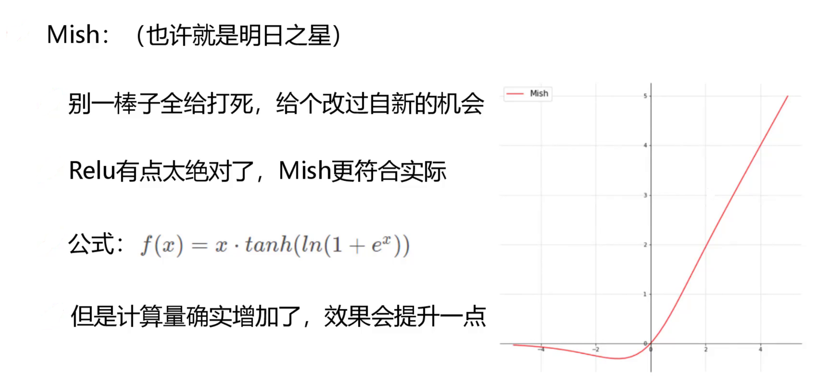 随着后期硬件越来越好,我们可以采用训练成本高点但是效果好点的方式了。例如之前我们采用RELU激活函数,现在改成了Mish