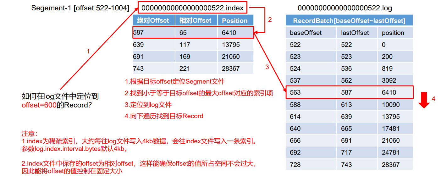 Kafka 的日志按 Segment 分段存储,每个 Segment 对应一段连续的 offset 范围。首先确定目标 offset=600 所属的 Segment 文件,图中对应的是Segement-1 [offset:522-1004],其索引文件为00000000000000000522.index。