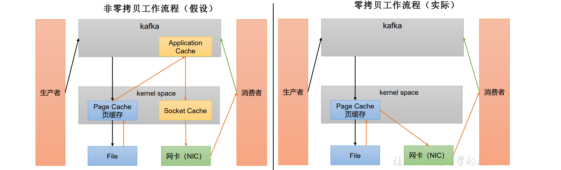 零拷贝:Kafka的数据加工处理操作交由Kafka生产者和Kafka消费者处理。Broker只负责存储和转发,不关心数据具体是什么,因此数据的处理不走应用层。