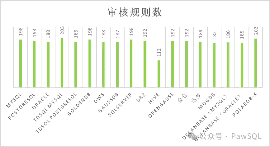 PawSQL在审核规则的全面性与对各类数据库支持的均衡性方面遥遥领先。其规则集全面覆盖SQL开发规范、安全性、可维护性与性能等维度,并在主流数据库上均保持约200条规则,确保无论您使用何种数据库,都能获得统一、专业的审核体验。