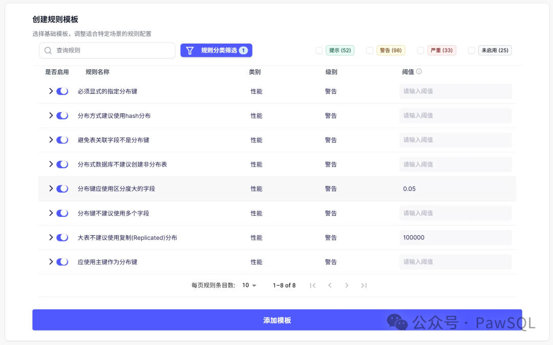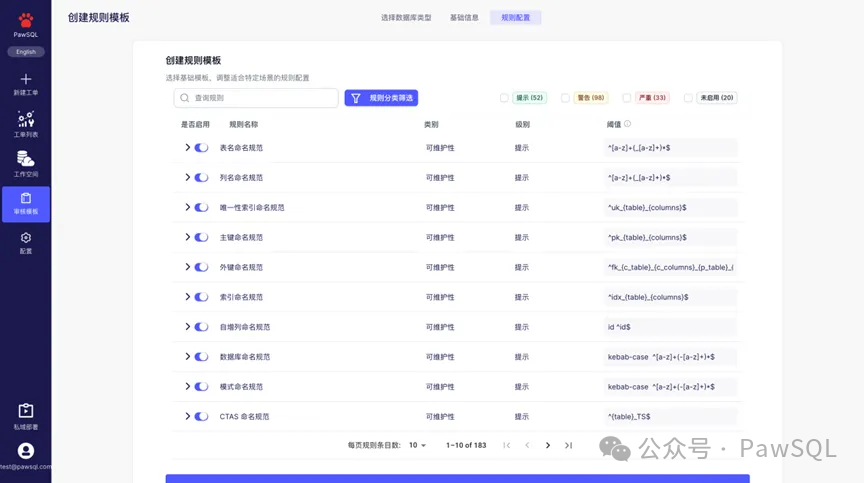审核模板是PawSQL中将最佳实践固化为自动化检查的核心机制。用户可根据不同数据库与业务场景,自定义规则集与阈值,从而统一团队SQL编写风格,主动预防性能瓶颈与安全风险,提升开发效率。
