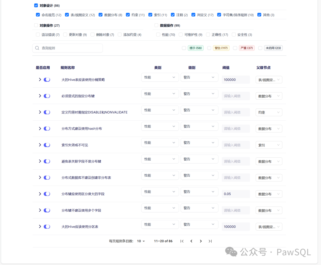 PawSQL为分布式数据库定制了与数据分布相关的专项审核规则,助力开发者在分布式环境下实现更优的查询性能与扩展性。