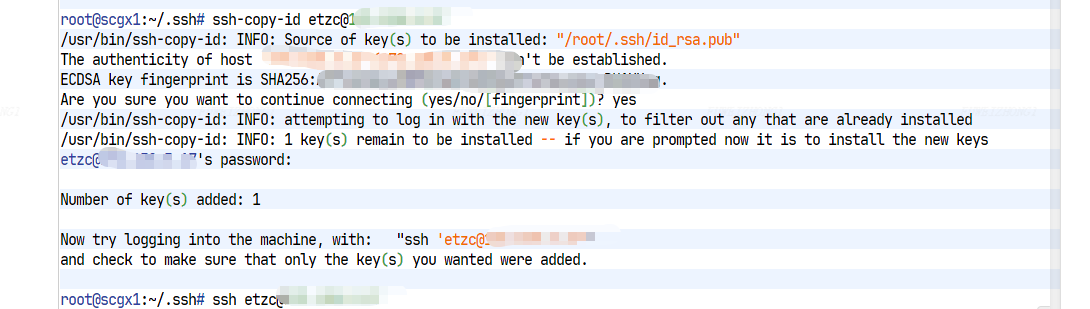 (2)传输公钥到目标机 ssh-copy-id 用户@目标ip 操作需要输入yes