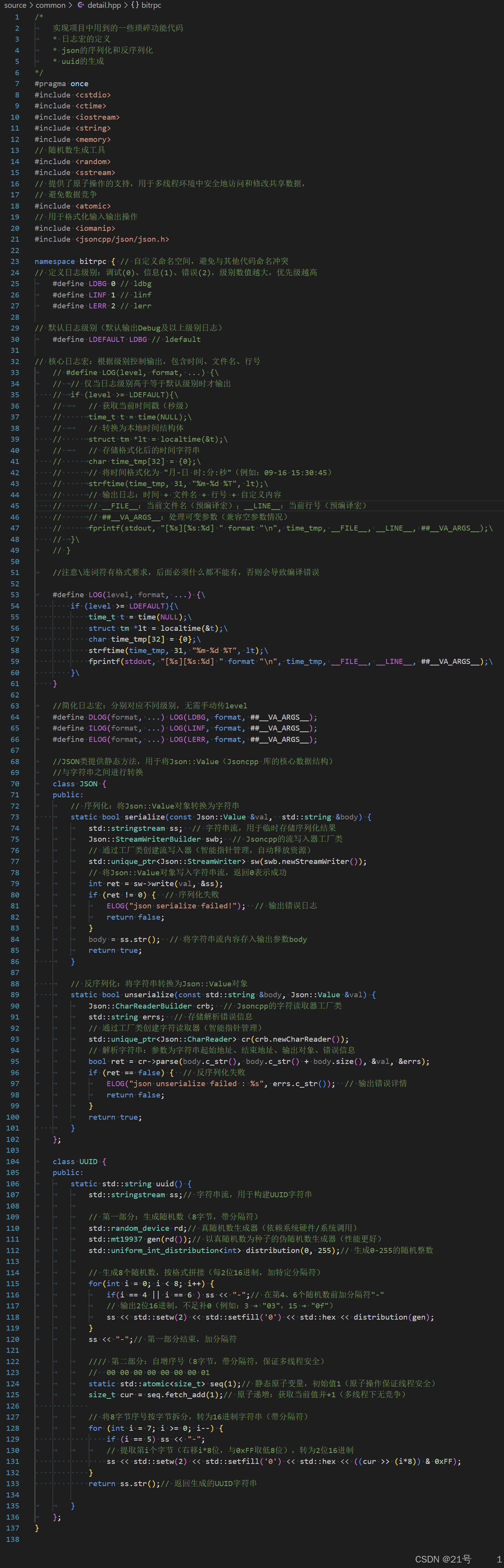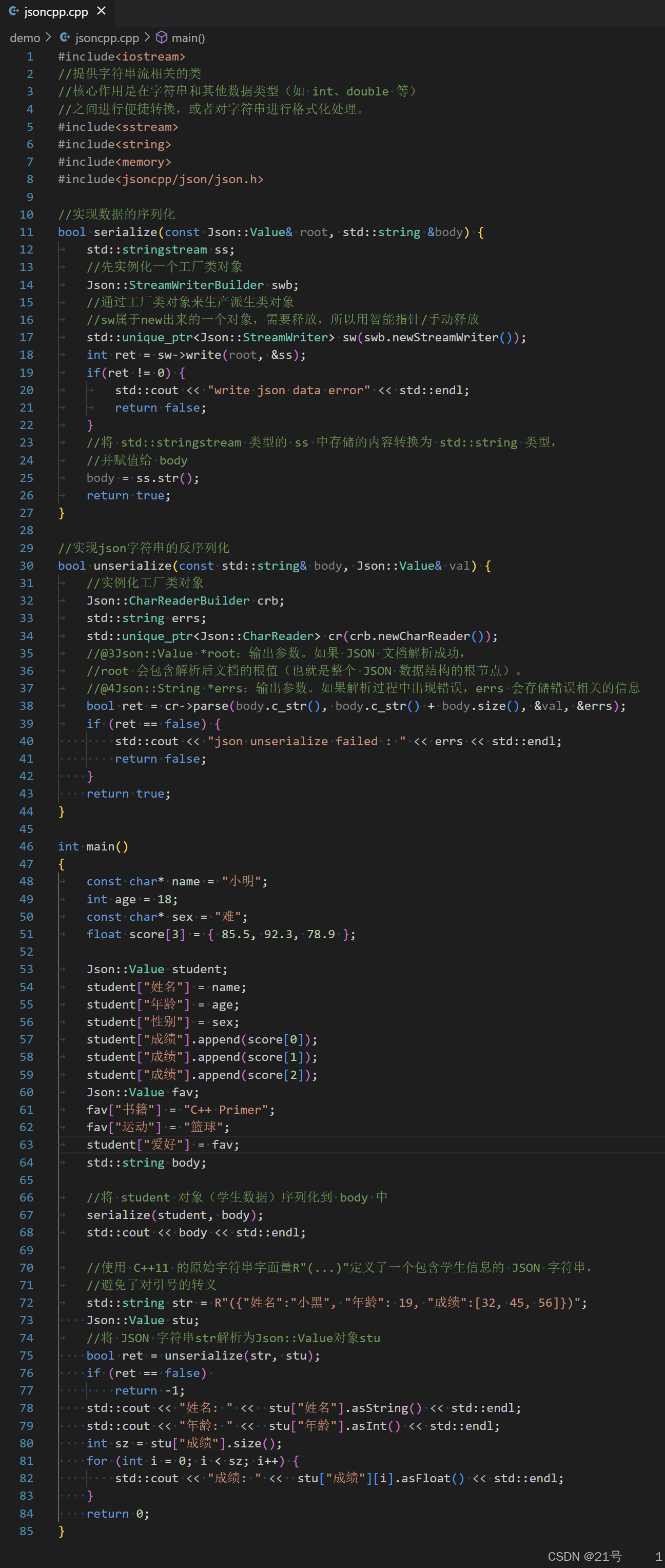 class JSON_API CharReader { /parse 反序列化函数virtual bool parse(char const* beginDoc, char const* endDoc, Value* root, std::string* errs) = 0;
