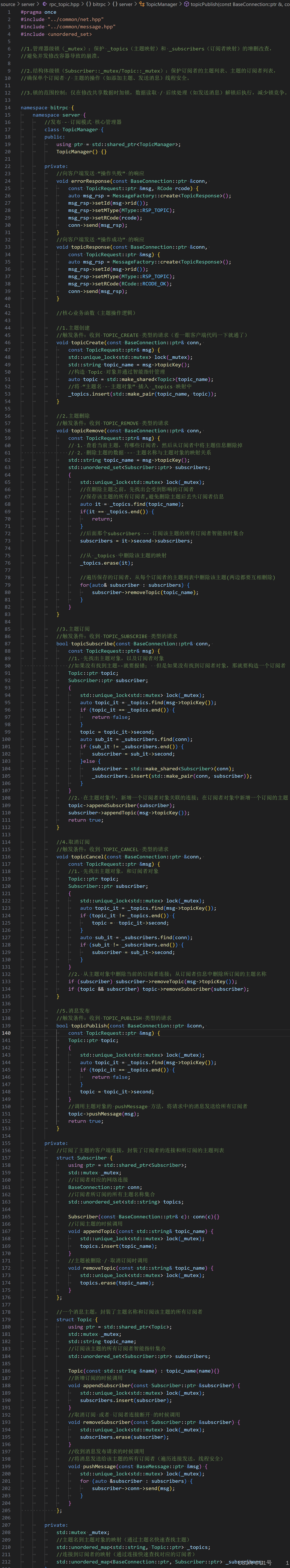 例如:Topic::pushMessage(向所有订阅者发送消息)是典型的 “读操作”(遍历 subscribers),如果多个线程同时向不同的 Topic 发送消息,结构体锁可以让这些操作并行执行,而无需等待全局锁。