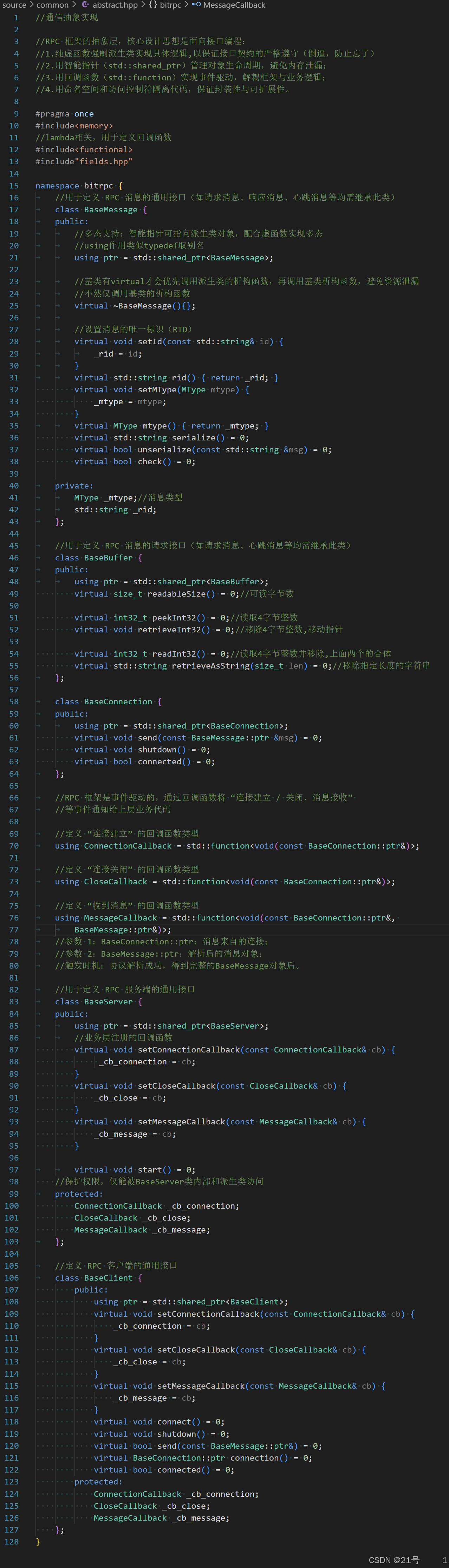 using MessageCallback = std::function<void(BaseConnection::ptr&, / 连接对象(非const引用)std::shared_ptr<T> / 消息对象(shared_ptr智能指针)
