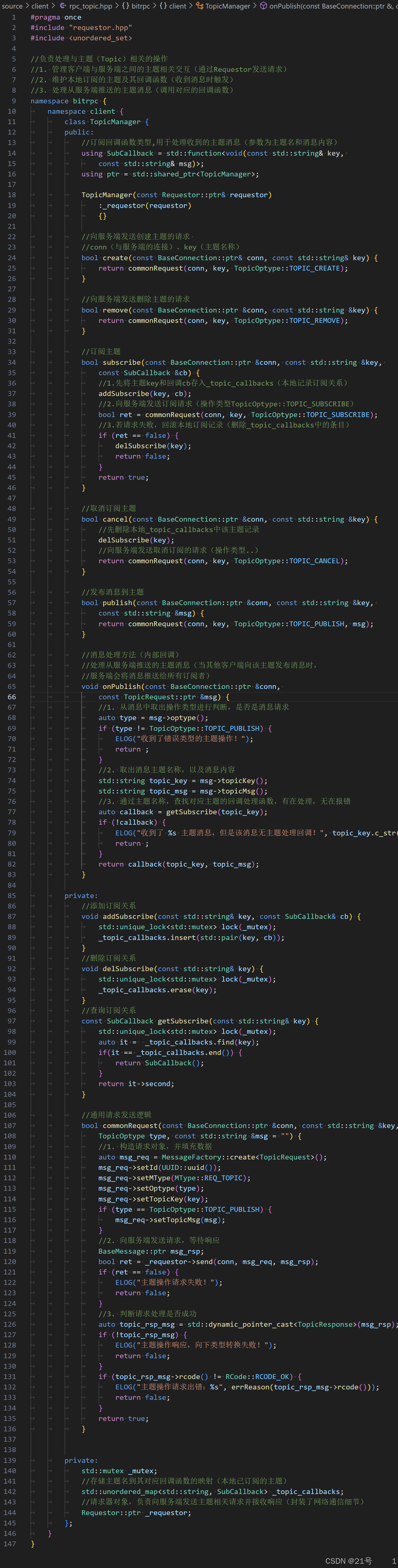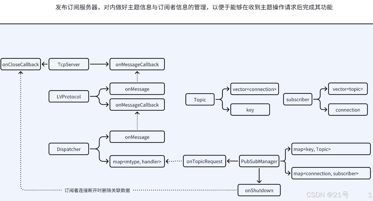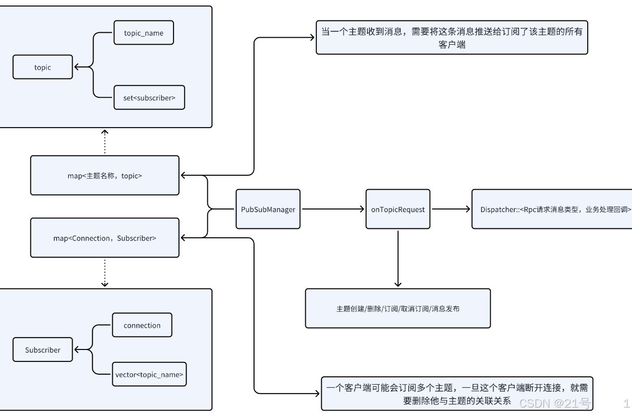 _topics:std::unordered_map<std::string, Topic::ptr>(主题名 → 主题对象)_subscribers:std::unordered_map<BaseConnection::ptr, Subscriber::ptr>(连接 → 订阅者对象)