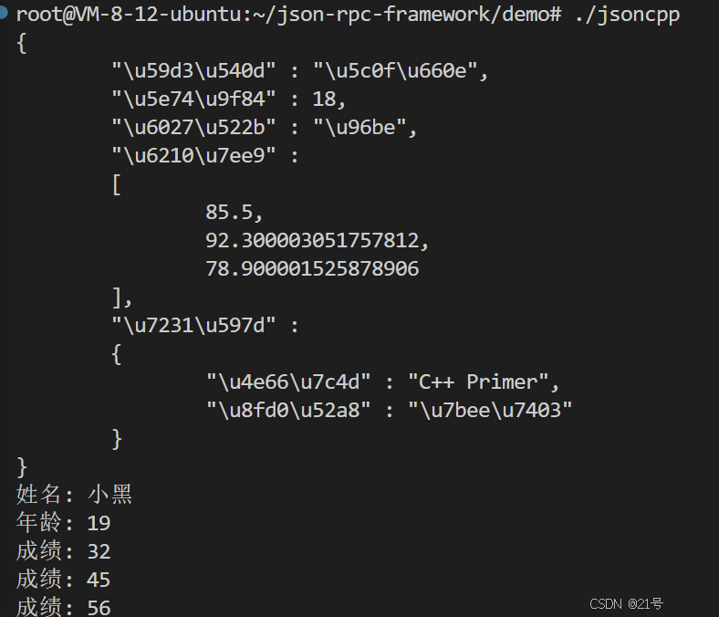 val["name"].asCString();Int asInt() const;//转int int age = val["age"].asInt();float asFloat() const;//转float float weight = val["weight"].asFloat();bool asBool() const;//转 bool bool ok = val["ok"].asBool();