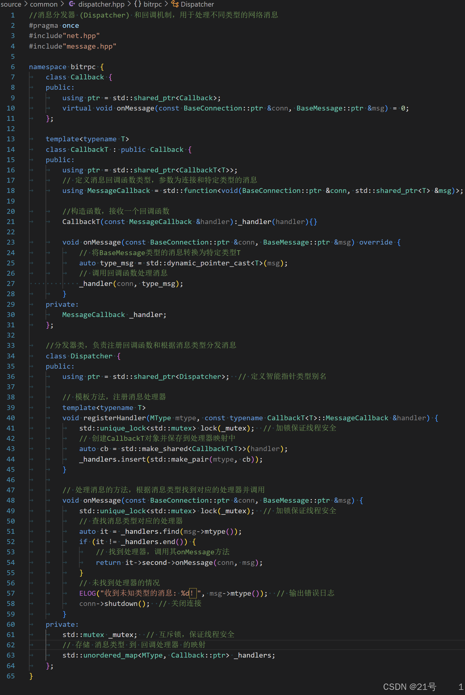 public:// 我们的处理函数,参数可能与调度器要求不一致void onResponse(const BaseConnection::ptr& conn, // const引用(与调度器的非const冲突)BaseMessage::ptr& msg // 可能是另一种智能指针类型(与shared_ptr冲突)) {// 实际处理响应的逻辑}
