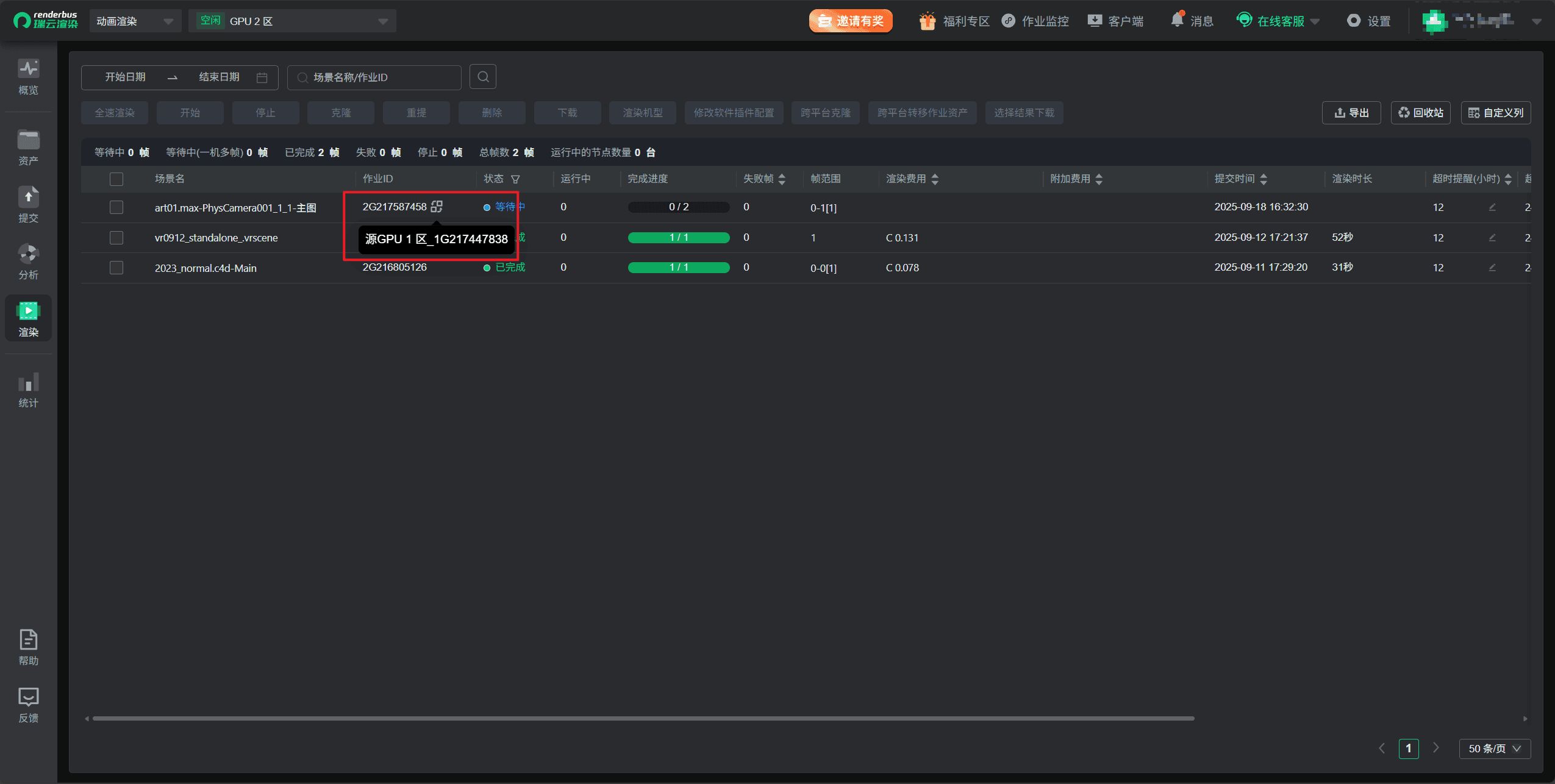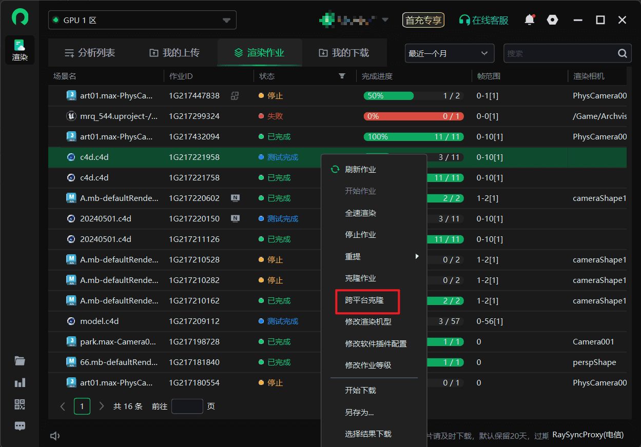 跨平台克隆作业成功后,可前往克隆平台的【渲染页面】,查看克隆生成的新作业。