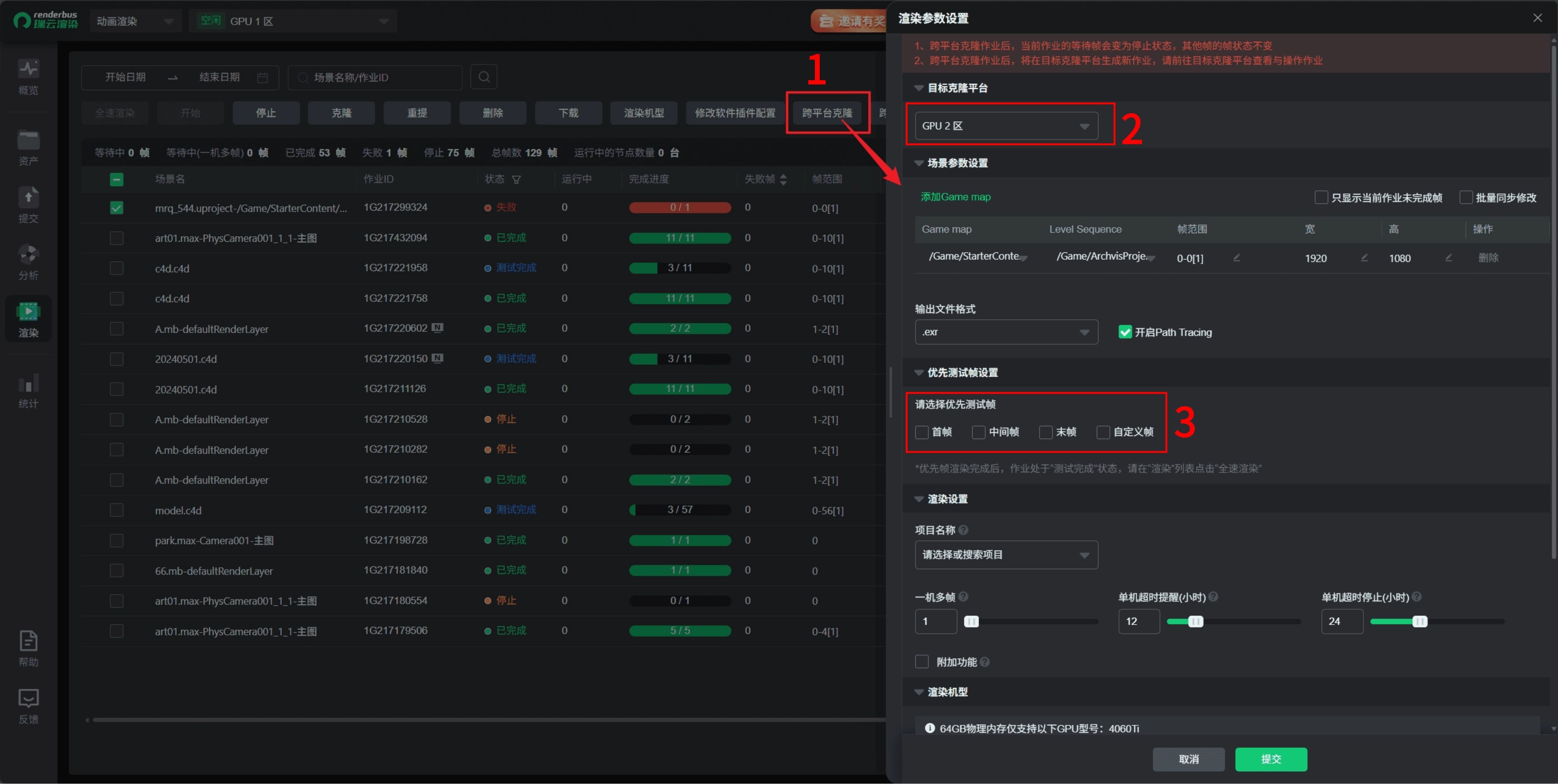 收到资产转移成功提示后,在当前页继续点击【跨平台克隆】 - 选择与步骤一相同的【目标克隆平台】(如:GPU2区) - 设置【优先帧设置】 - 最后【提交】。