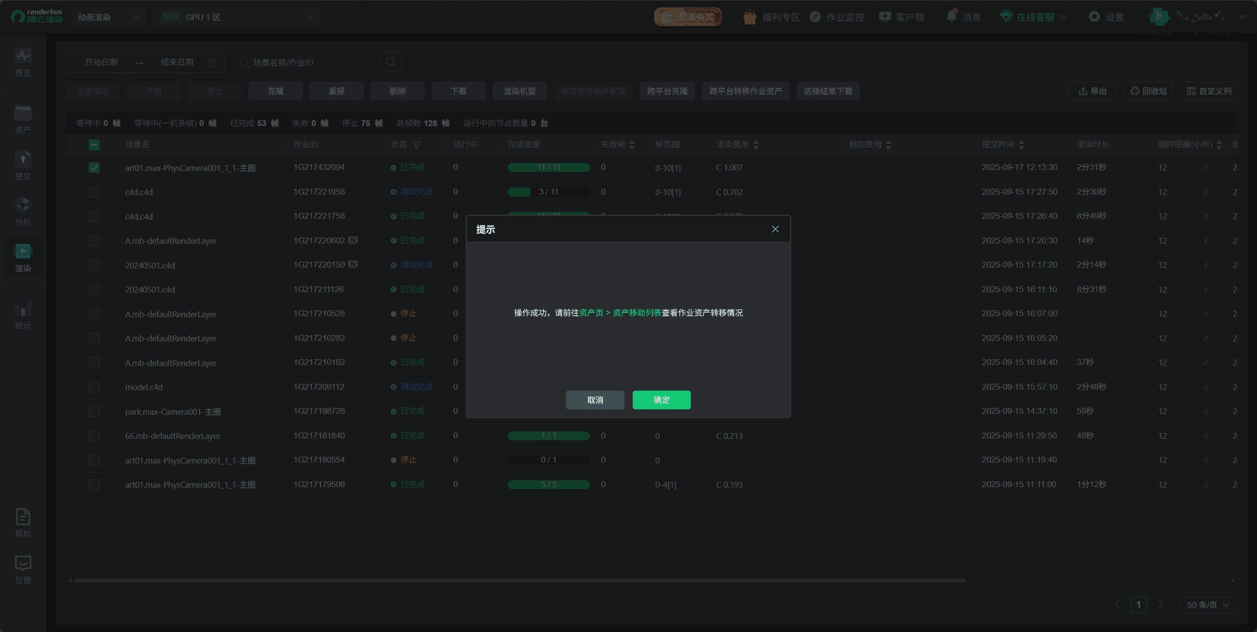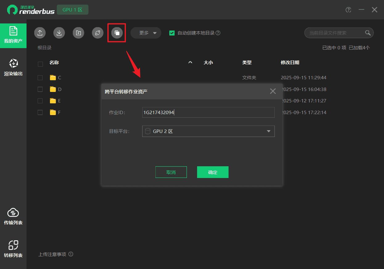 登录网页端后,点击作业所在的CPU/GPU区域(如GPU1区),再点击页面左侧的【渲染】 - 勾选需要转移区域的作业资产 - 点击【跨平台转移作业资产】按钮 - 在弹窗中选择你要转移的【目标平台】(如:GPU2区) - 点击【确定】。