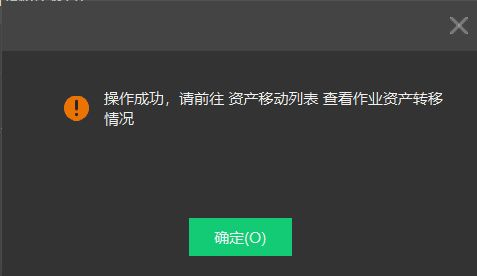 转移成功将会收到弹窗提醒,点击【资产页>资产移动列表】可进入查看作业资产的转移进度与结果;如不需要查看点击【确定】即可。