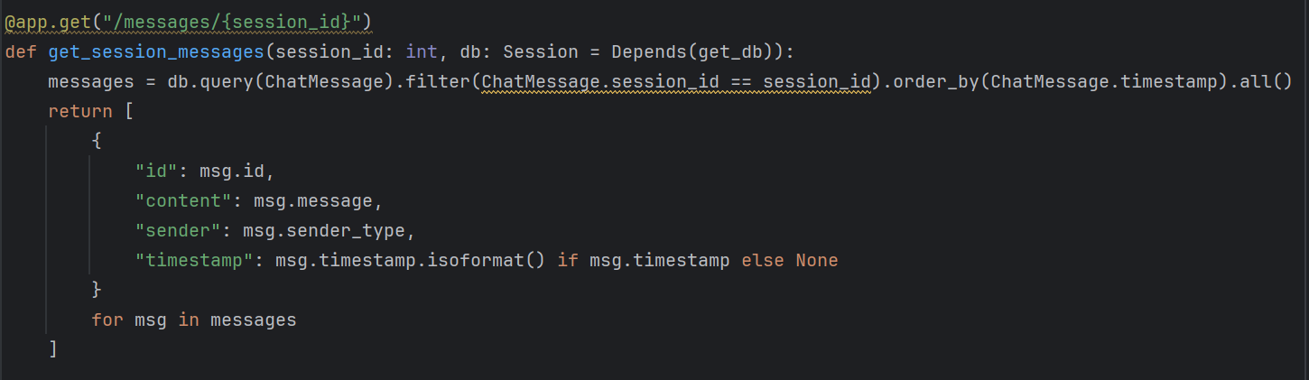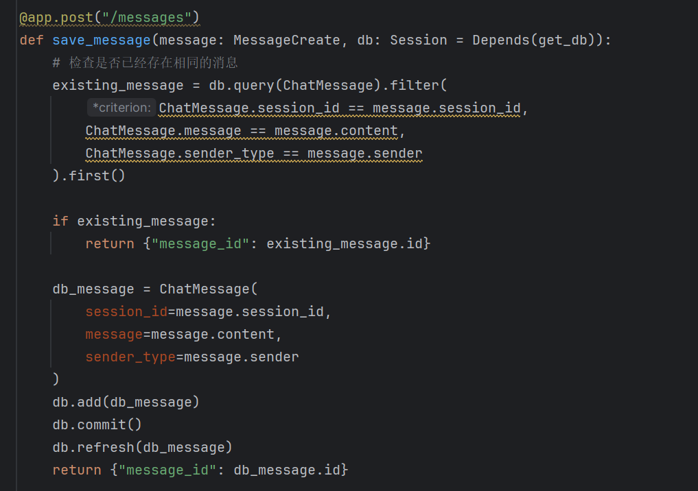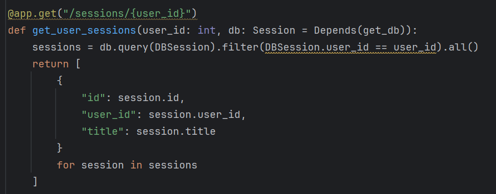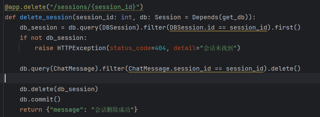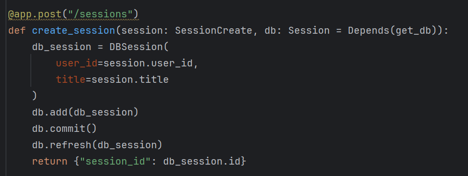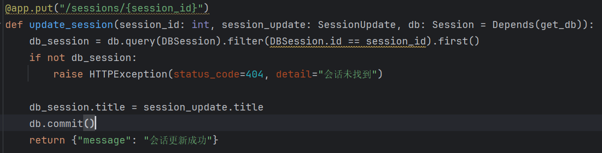 接收一个 SessionCreate 类型的请求体数据,初始化会话标题, SessionCreate 类型中设置title="新会话"。db: Session = Depends(get_db): 通过依赖注入获取数据库会话,将新会话添加到数据库中并且提交能够通过会话id查看