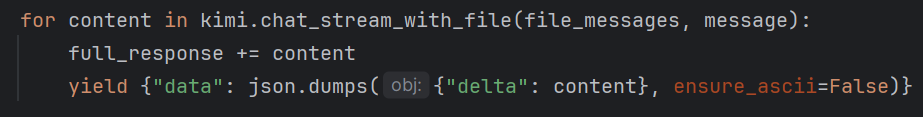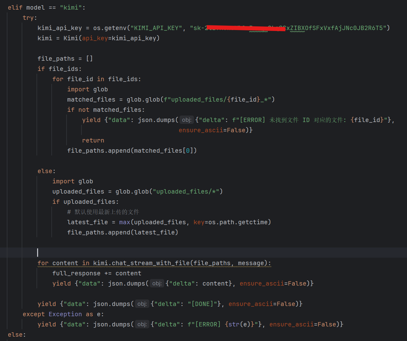 如果返回的模型数据是kimi的话,会首先判断用户是否传入文件信息,如果有就采用对文件进行读取回复,如果没有的话就会使用普通聊天流式输出回复。