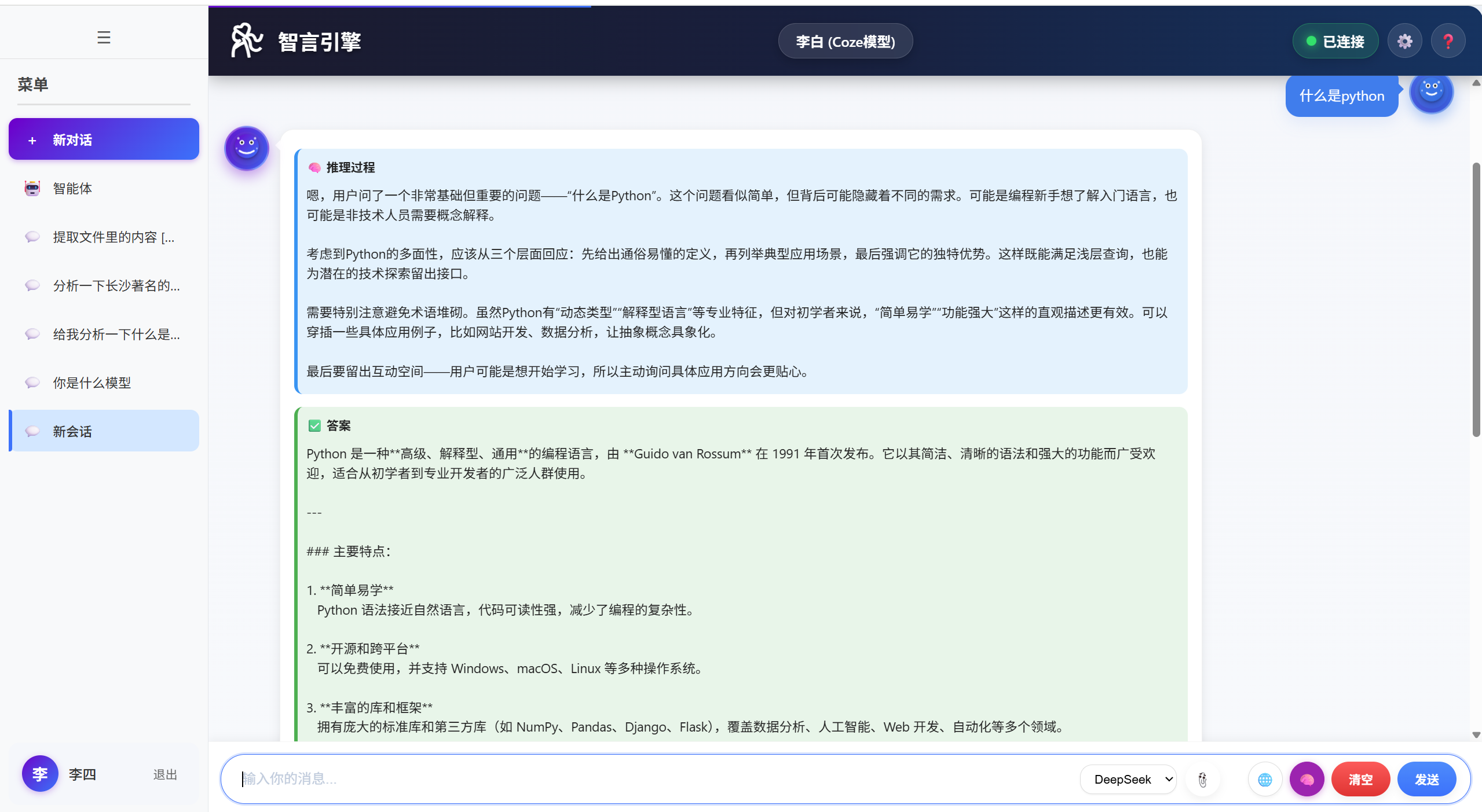 云调用ai api实现不同的模型在本地的部署,可以切换模型得到不同的回答和不同功能。接入我在Coze部署的本地智能体,与我的智能体进行聊天,让功能不再单调。