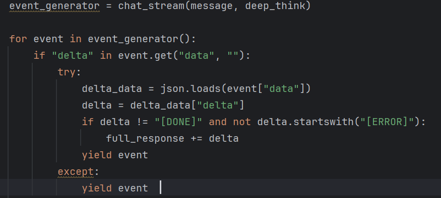 创建事件流,对事件流进行处理,使用yield与SSE配合完美实现后端逐段传输数据给前端,前端事件接收到服务器流式传输的数据内容,在前端页面逐字显示,实现完美的流式输出。