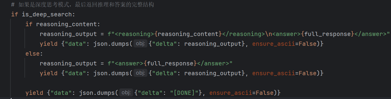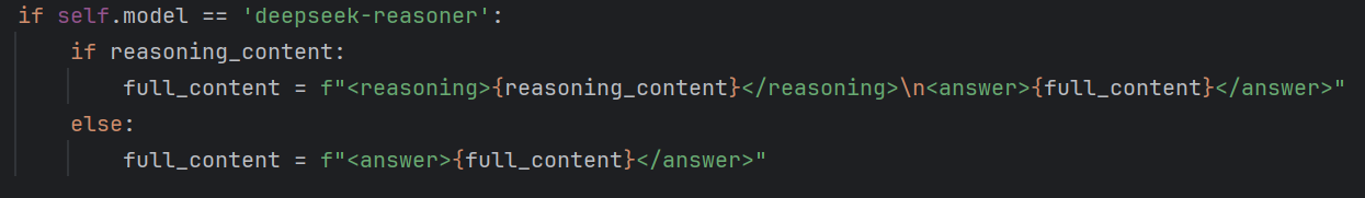 前端深度思考按钮打开的话,则会返回模型为deepseek-reasoner的数据给后端,后端就会用接收到的数据设置模型参数