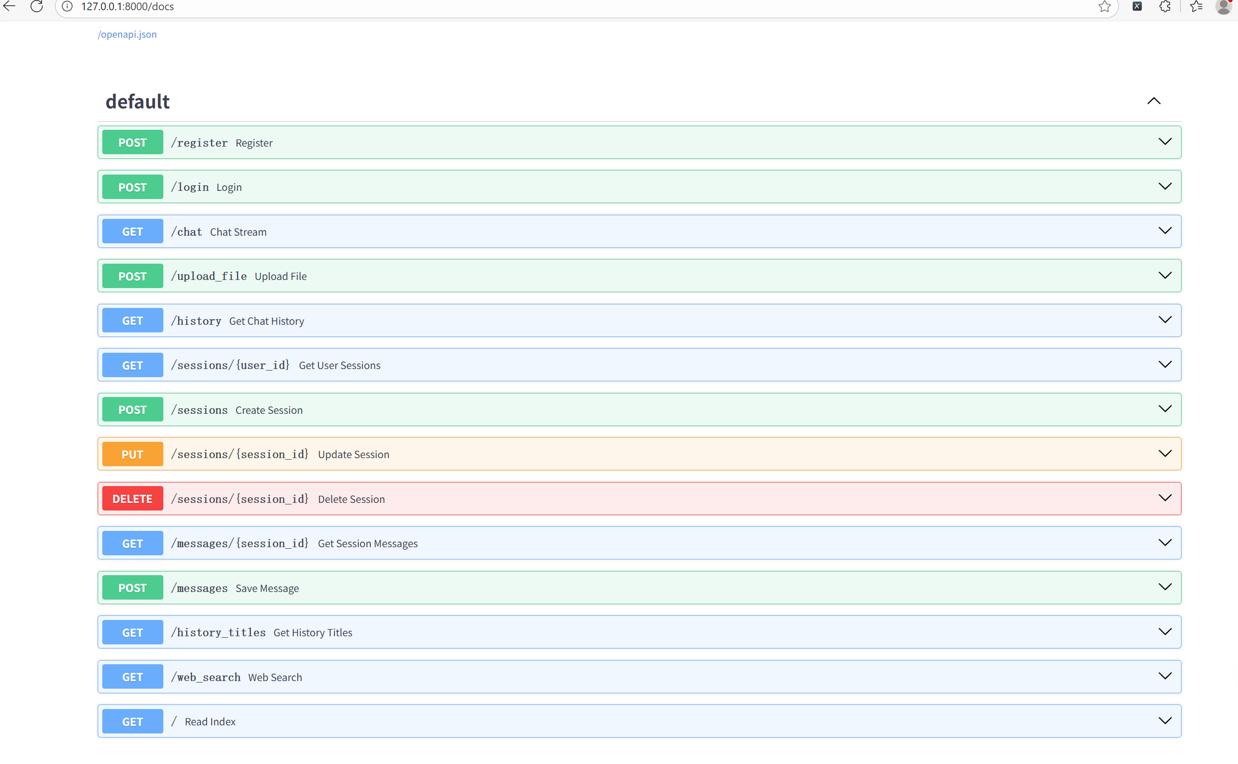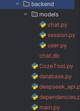 fastapi接口和数据库的搭建 --- 解决方式:结合我想要实现的效果和功能实现,搭建了登陆注册、聊天、历史记录、联网搜索等接口。数据库方面构建用户、会话、历史记录表,分别用来存储用户的注册信息;当前会话的id和标题选择;根据用户id匹配历史记录,登录即展示。