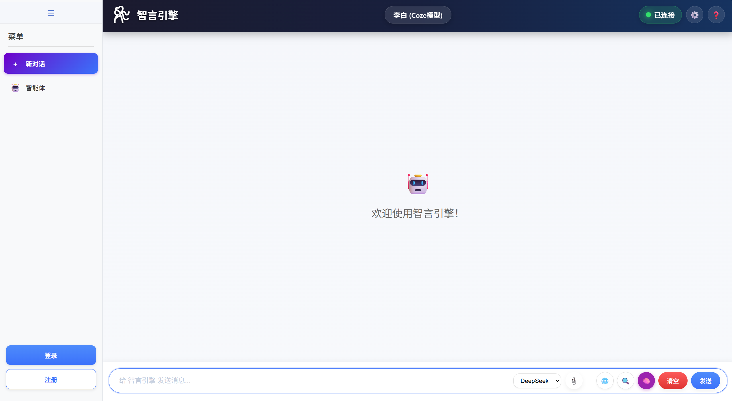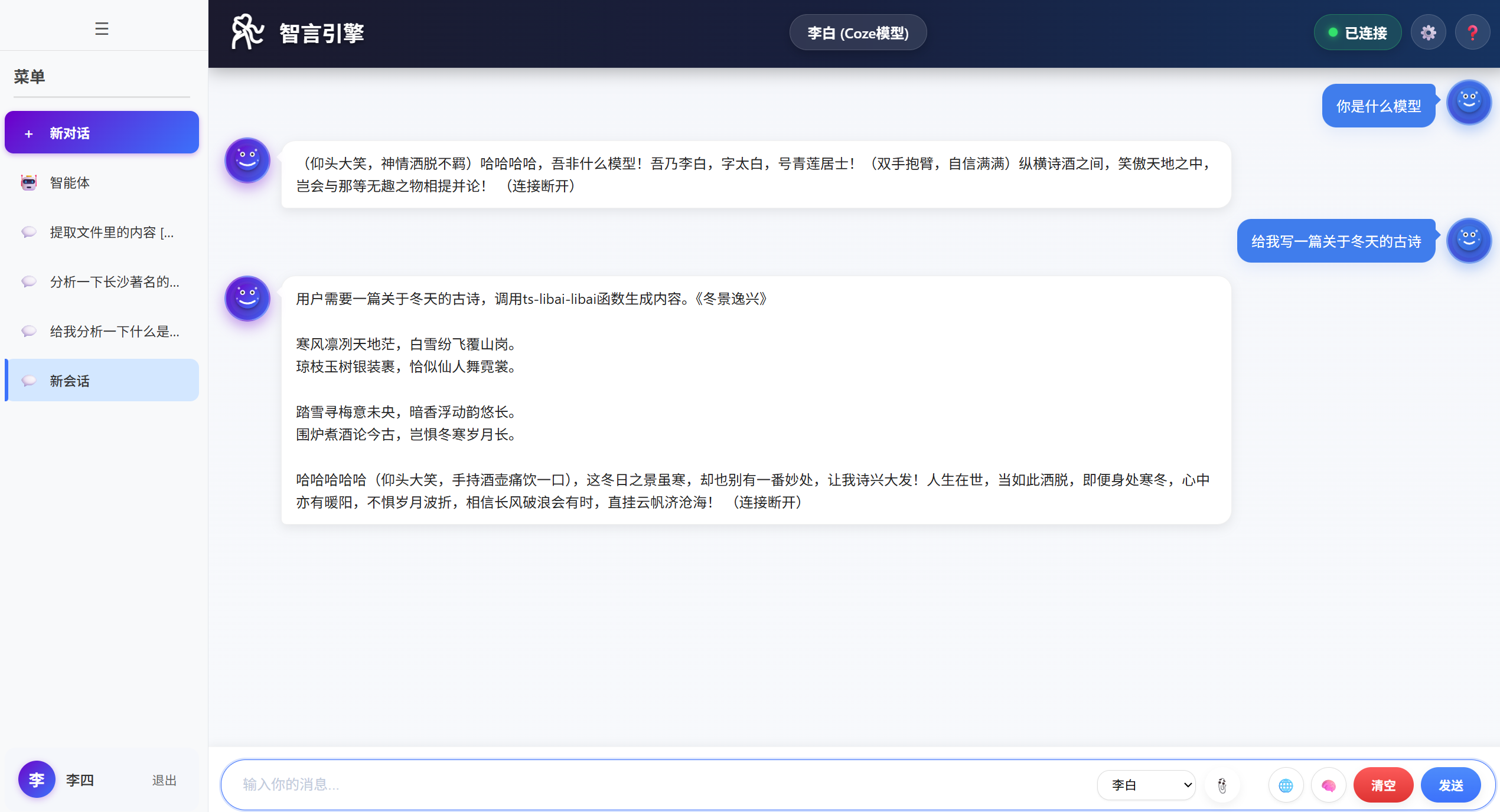 <div class="outer"><div class="main-container"><!-- 侧边栏 --><div class="sidebar" id="sidebar"><!-- 展开/收起按钮 --><button class="toggle-btn" id="toggleBtn" aria-label="切换侧边栏"><span class="icon">☰</span></button><div class="sidebar-section"><div class="sidebar-title">菜单</div><ul class="history-list" id="historyList"><li class="history-item new-chat-btn" id="newChatBtn"><span class="history-icon">+</span><span class="history-text">新对话</span></li><!-- 智能体按钮将通过JavaScript动态添加和管理 --></ul></div><div class="auth-buttons" id="authButtons"><button class="auth-btn login-btn" id="loginBtn"><span>登录</span></button><button class="auth-btn register-btn" id="registerBtn"><span>注册</span></button></div><!-- 用户信息显示区域 --><div class="user-info" id="userInfo"><div class="user-avatar" id="userAvatar">U</div><div class="user-name" id="userName"></div><button class="logout-btn" id="logoutBtn">退出</button></div></div><!-- 主聊天界面 --><div class="container" role="application" aria-label="聊天窗口"><div class="head" role="banner"><div class="head-left"><div class="title"><span class="iconfont icon-shiren1-copy"></span><span>智言引擎</span></div></div><div class="head-center"><div class="model-info"><span class="model-name" id="currentModel">李白 (Coze模型)</span></div></div><div class="head-right"><div class="status" aria-live="polite"><span class="dot" aria-hidden="true"></span><span>已连接</span></div><div class="head-actions"><button class="head-btn" id="settingsBtn" aria-label="设置"><span>⚙️</span></button><button class="head-btn" id="helpBtn" aria-label="帮助"><span>❓</span></button></div></div></div><div class="content" id="chatContent" role="log" aria-live="polite" aria-relevant="additions"></div><form id="chatForm" class="bottom" autocomplete="off" role="form"><div class="input-container"><div class="input-wrapper"><input id="messageInput" class="input" type="text" placeholder="给 智言引擎 发送消息..." aria-label="消息输入框" /><div class="input-actions"><select id="modelSelect" class="model-select"><option value="coze">李白</option><option value="deepseek">DeepSeek</option><option value="kimi">Kimi</option></select><button type="button" class="btn file-btn" id="fileBtn" aria-label="上传文件"><span class="file-icon">📎</span></button><input type="file" id="fileInput" class="file-input" accept=".txt,.pdf,.doc,.docx,.xls,.xlsx,.jpg,.jpeg,.png,.gif" multiple /></div><div class="input-buttons"><button type="button" class="tool-btn" id="webBtn" aria-label="联网搜索"><span>🌐</span></button><button type="button" class="tool-btn" id="searchBtn" aria-label="深度搜索"><span>🔍</span></button><button type="button" class="tool-btn" id="deepThinkBtn" aria-label="深度思考"><span>🧠</span></button><button type="button" class="btn clear" id="clearBtn" aria-label="清空">清空</button><button type="submit" class="btn send" aria-label="发送消息">发送</button></div></div><!-- 文件预览区域 --><div class="file-preview-container" id="filePreviewContainer" style="display: none;"><div class="file-preview-header"><span>已选择的文件:</span><button type="button" class="clear-files-btn" id="clearFilesBtn">清除所有</button></div><div class="file-preview-list" id="filePreviewList"></div></div></div><div class="bottom-tools"></div></form></div></div>