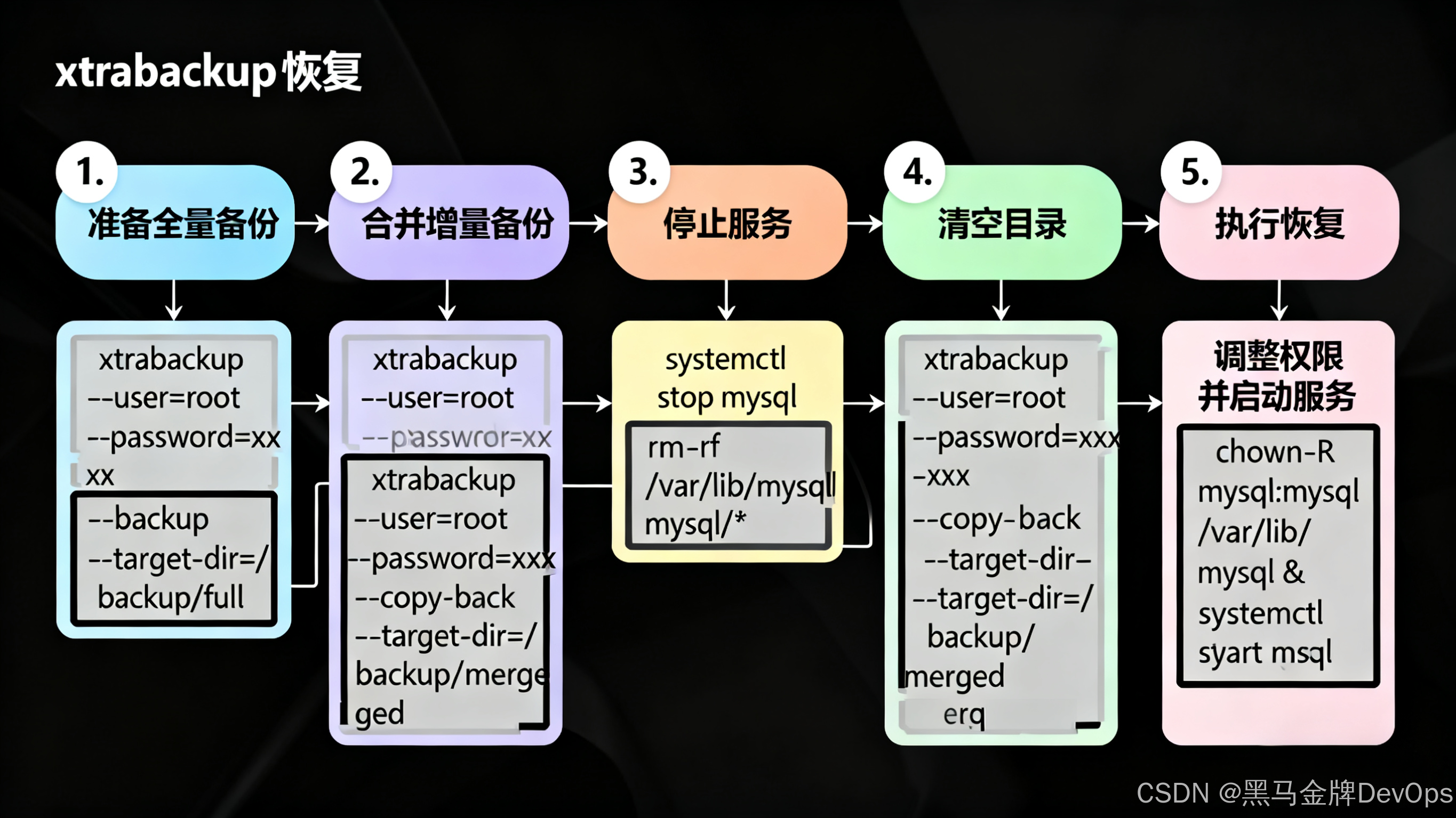 - 备份准备(prepare):备份文件生成后需执行此操作,用于整合数据、确保数据一致性,为恢复做准备。
