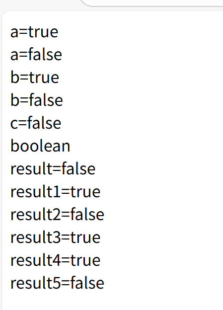 </head><body><script>// !非 , !可以用来对一个值进行非运算// 所谓非运算就是值对一个布尔值进行取反操作//true变false false变truevar a = true;document.write("a=" + a + "<br>");document.write("a=" + !a + "<br>");//如果对一个值进行两次取反,它将不会发生变化var b = true;document.write("b=" + b + "<br>");document.write("b=" + !b + "<br>");//如果对非布尔类型的元素进行取非,它将会转换为布尔值在取反//所以我们可以利用该特点,来将一个其他的数据类型转变为布尔类型//可以为一个任意数据类型取反两次,来将其转换为布尔值//原理和Boolean()函数一样var c = 10;c = !c;document.write("c=" + c + "<br>");document.write(typeof c+"<br>");//&& 与 , && 可以对符号两侧的值进行与运算并返回结果//两个值中只要有一个值为false就返回falsevar result = true && false;document.write("result=" + result+"<br>");//只有两个值都为true时,才会返回truevar result1 = true && true;document.write("result1=" + result1+"<br>");//JS中的"与"属于短路与//如果第一个值为false,则不会去看第二个值var result2 = false && true;document.write("result2=" + result2+"<br>");// || 或 , || 可以对符号两侧的值进行或运算并返回结果//两个值只要有一个true,就返回truevar result3=true||false;document.write("result3=" + result3+"<br>");var result4=true||true;document.write("result4=" + result4+"<br>");//如果两个值都为false,才会返回falsevar result5=false||false;document.write("result5=" + result5+"<br>");//JS中的"或"属于短路的或//如果第一个值为true,则不会检查第二个值</script>