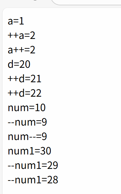 </head><body><script>//自增可以使变量在原值的基础上自增1//自增使用++//自增可以使用a++,与++a//无论是++a还是a++动员会立即使原变量自增1//不同的式++a和a++的值式不同的//++a的值是变量的新值(自增后的值)//a++的值是变量的原值(自增前的值)var a = 1;document.write("a=" + a + "<br>");document.write("++a=" + ++a + "<br>");document.write("a++=" + a++ + "<br>");var d = 20;document.write("d=" + d + "<br>");document.write("++d=" + ++d + "<br>");document.write("++d=" + ++d + "<br>");//自减可以使变量在原值的基础上自减1//自减使用--//自减可以使用--a与a--//无论是--a 还是a--都会立即使原变量自减1//不同的是–a和a–的值//--a的值是变量的新值(自减后的值)//a--的值是变量的原值(自减前的值)var num = 10;document.write("num=" + num + "<br>");document.write("--num=" + --num + "<br>");document.write("num--=" + num-- + "<br>");var num1 = 30;document.write("num1=" + num1 + "<br>");document.write("--num1=" + --num1 + "<br>");document.write("--num1=" + --num1 + "<br>");</script>