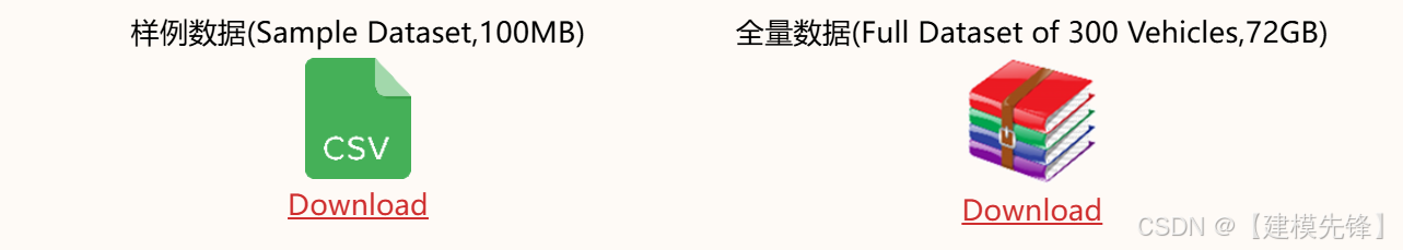 数据以CSV格式文件存储。本页面提供样例数据集(100MB)下载链接和全量数据集(72GB)下载链接。