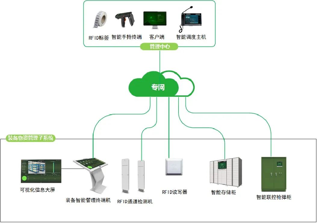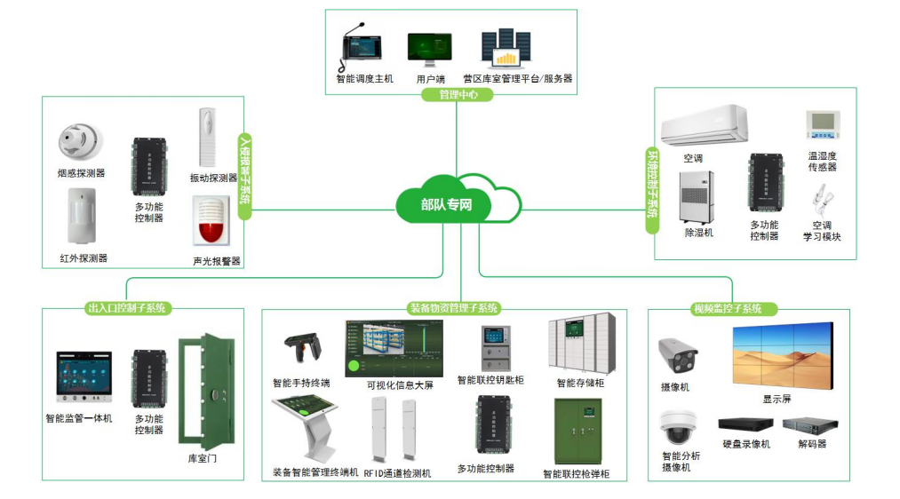 智慧营区库室管控系统采用 “数据机房 + 指挥中心 + 库室管理 + 物资管理” 的分层架构,各层级通过内部专用网络实现高效联动: