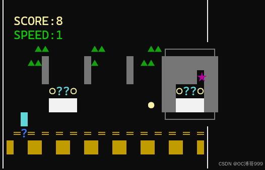 public:int x, y;bool jumping;bool ducking;int jumpHeight;int jumpCounter;int normalHeight;int duckHeight;bool hasJetpack;int jetpackTime;bool doubleScore;int doubleScoreTime;Player() : x(3), y(8), jumping(false), ducking(false), jumpHeight(5), jumpCounter(0), normalHeight(8), duckHeight(9), hasJetpack(false), jetpackTime(0),doubleScore(false), doubleScoreTime(0) {}void jump() {if (!jumping && !ducking) {jumping = true;jumpCounter = 0;}}void startDuck() {if (!jumping) {ducking = true;y = duckHeight;} else {// 如果在跳跃中下蹲,加速下降jumpCounter = jumpHeight; // 立即进入下降阶段}}void endDuck() {ducking = false;y = normalHeight;}void activateJetpack() {hasJetpack = true;jetpackTime = 200; // 持续4秒}void activateDoubleScore() {doubleScore = true;doubleScoreTime = 200; // 持续4秒}void update() {// 更新道具时间if (hasJetpack) {jetpackTime--;if (jetpackTime <= 0) {hasJetpack = false;}}if (doubleScore) {doubleScoreTime--;if (doubleScoreTime <= 0) {doubleScore = false;}}if (jumping) {if (hasJetpack) {// 喷气背包:缓慢下降if (jumpCounter < jumpHeight * 2) {y--;} else if (jumpCounter < jumpHeight * 3) {// 保持高度} else if (jumpCounter < jumpHeight * 4) {y++;} else {jumping = false;y = normalHeight;}} else if (ducking) {// 下蹲时加速下降y += 2;if (y >= duckHeight) {y = duckHeight;jumping = false;}} else {// 正常跳跃if (jumpCounter < jumpHeight) {y--;} else if (jumpCounter < jumpHeight * 2) {y++;} else {jumping = false;y = normalHeight;}}jumpCounter++;}}void draw() {if (ducking) {setCursor(x, y);setColor(BRIGHT_CYAN);cout << "█";} else {setCursor(x, y);setColor(BRIGHT_CYAN);cout << "█";setCursor(x, y+1);setColor(BRIGHT_BLUE);cout << "?";}// 绘制喷气背包效果if (hasJetpack) {setCursor(x-1, y+2);setColor(BRIGHT_YELLOW);cout << "▲";setCursor(x+1, y+2);cout << "▲";}}