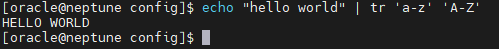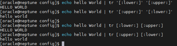 echo hello World | tr '[:lower:]' '[:upper:]' echo hello World | tr '[:upper:]' '[:lower:]'echo hello World | tr [:lower:] [:upper:] echo hello World | tr [:upper:] [:lower:]或: echo "hello world" | tr 'a-z' 'A-Z'截图:
