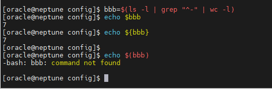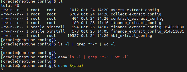 ls -l | grep "^-" | wc -l aaa=`ls -l | grep "^-" | wc -l` echo ${aaa}或者:bbb=$(ls -l | grep "^-" | wc -l) echo ${bbb}截图: