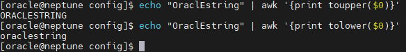 echo "OraclEstring" | awk '{print toupper($0)}'echo "OraclEstring" | awk '{print tolower($0)}'