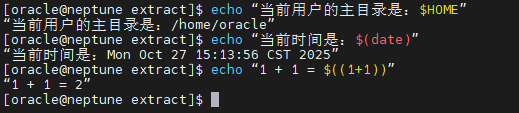– $((表达式)):用于进行算术运算。例如,$((2+2))将返回4。– `命令`:将命令的输出结果作为字符串进行替换。例如,`date`将返回当前的日期。
