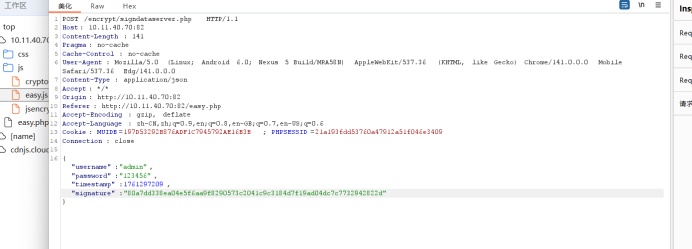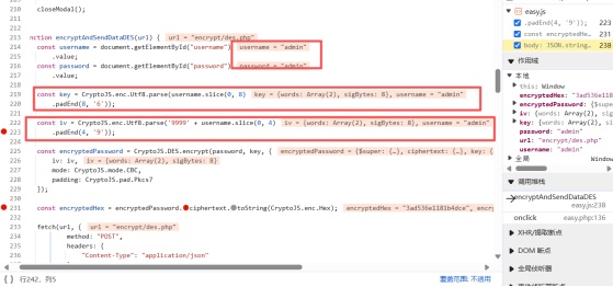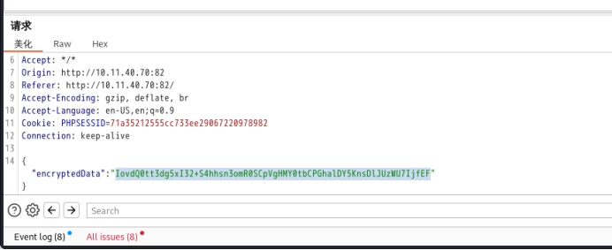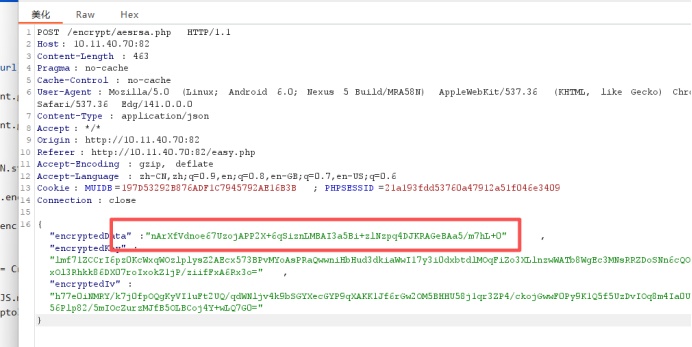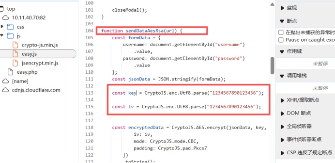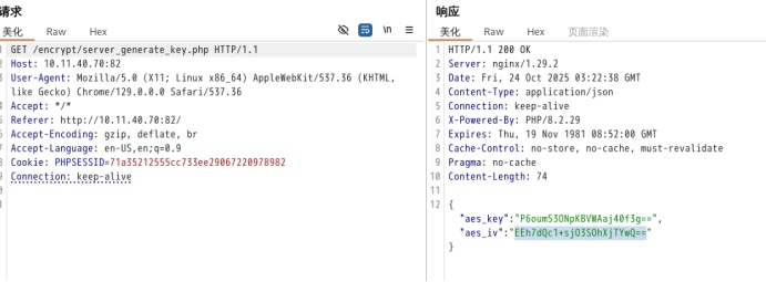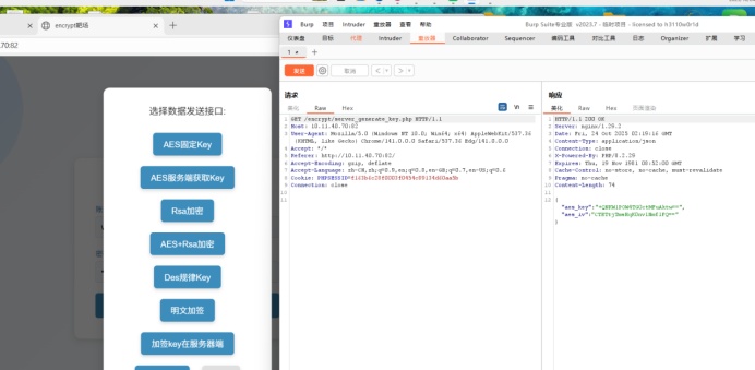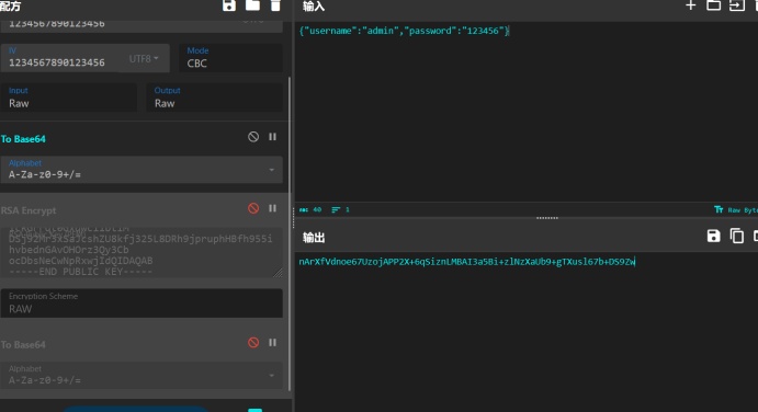 发送登录请求后抓包拦截响应请求可以看到服务端发回的key值和iv值,根据服务端给出的数值我们进行加密,得到加密后的值解密。