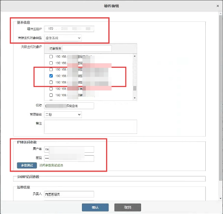 以上设备配置完成后,在MC平台操作上直接进行添加服务器硬件对象相关的IP、关联主机、IPMI登录的用户名和密码等信息就可以了,如图: