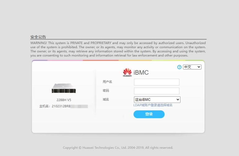 华为服务器的管理接口标识名称是:iBMC,服务器管理接口默认IP为:192.168.2.100,登录界面如下图: